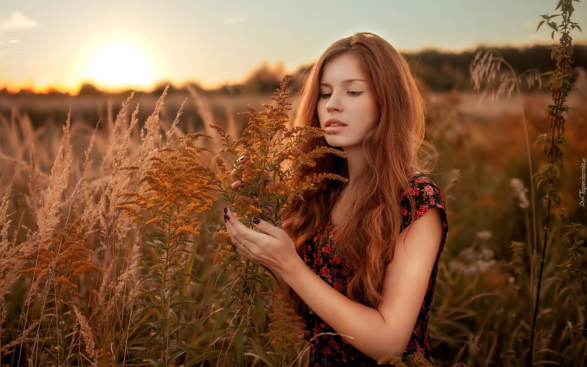Edytor tapety: Dziewczyna, Łąka, Trawy, Wschód, Słońca