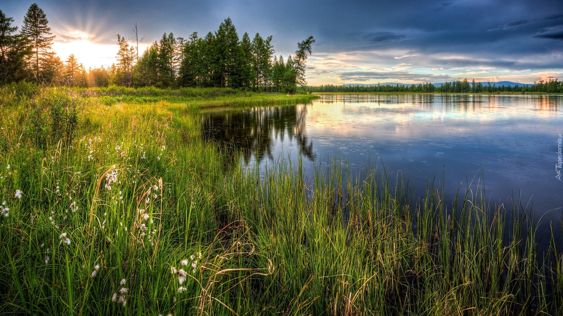 Edytor tapety: Jezioro, Las, Łąka, Promienie Słońca