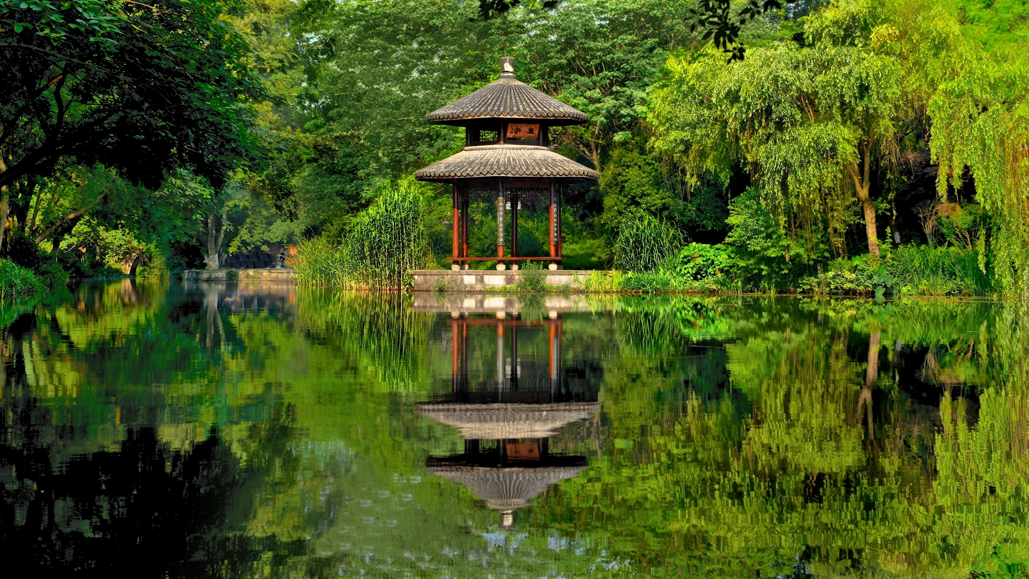 Edytor tapety: Chiński, Park, Altana, Staw, Drzewa