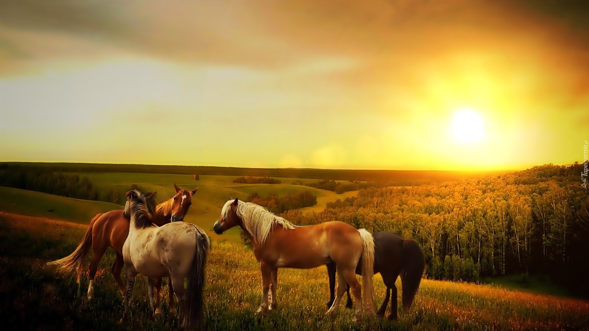 Edytor tapety: Konie, Łąka, Las, Poranek