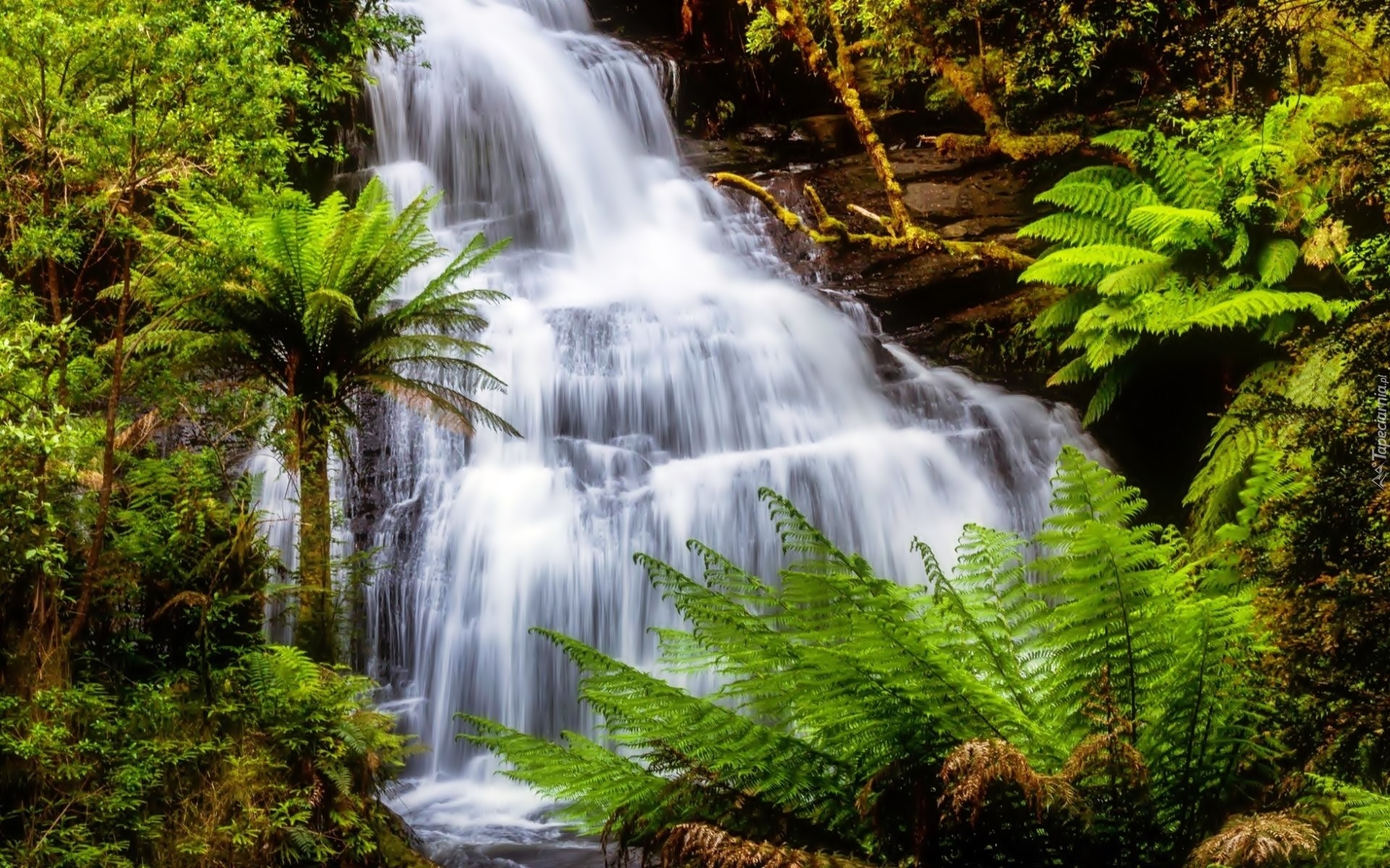Edytor tapety: Wodospad, Skały, Las, Paprocie