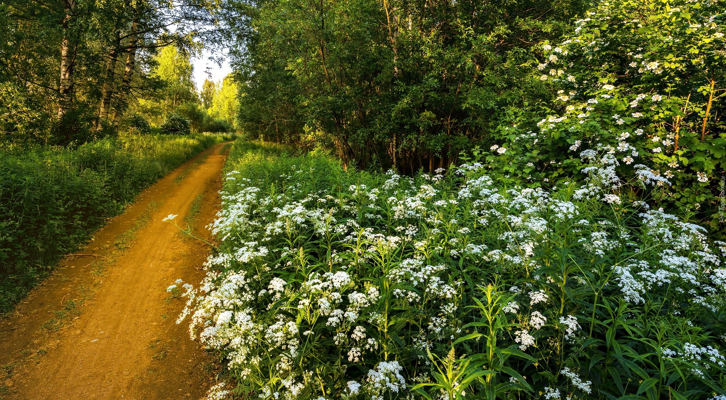 Edytor tapety: Las, Droga, Zarośla, Kwiaty