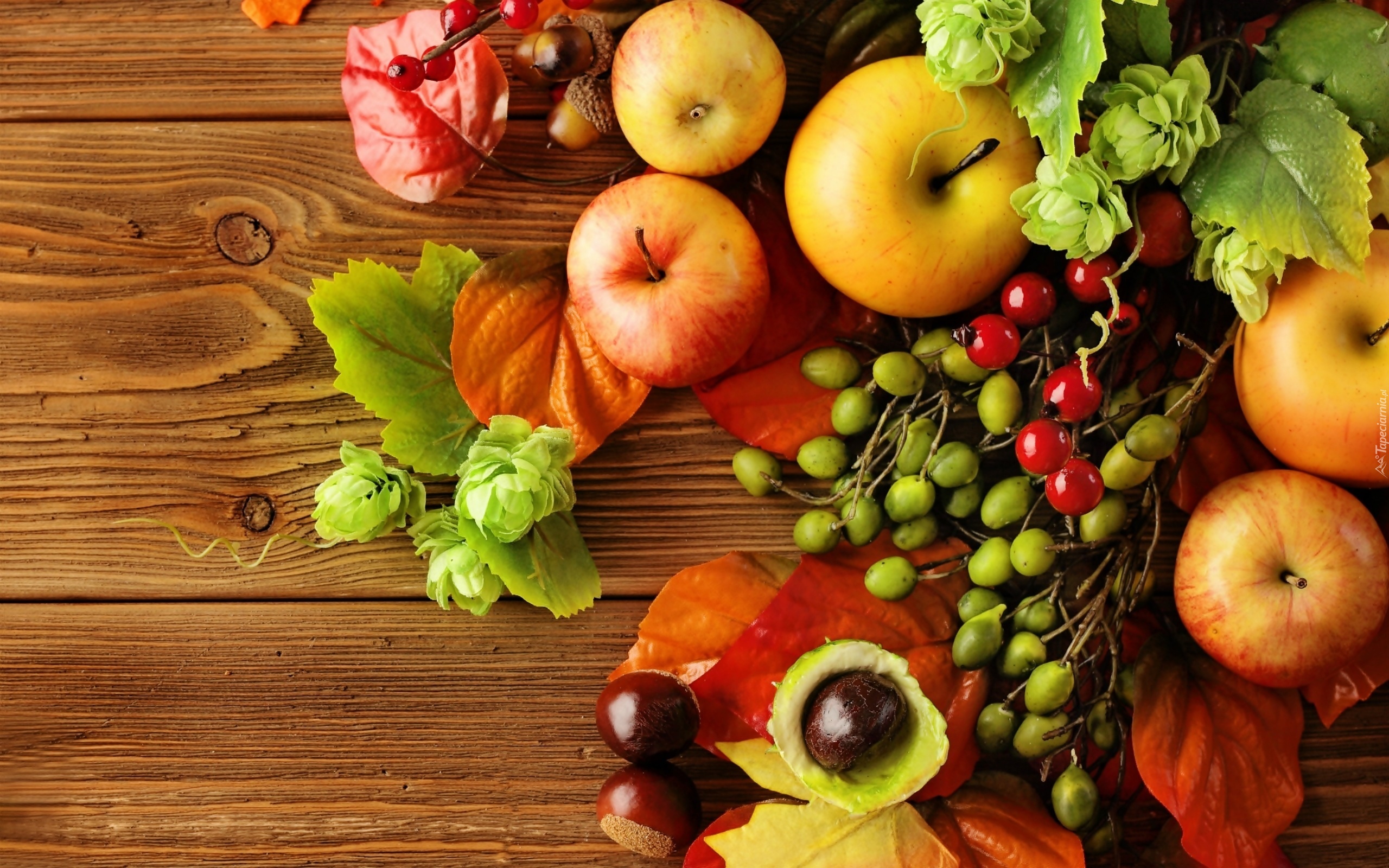 Edytor tapety: Jabłka, Kasztany, Liście, Kompozycja, Jesień