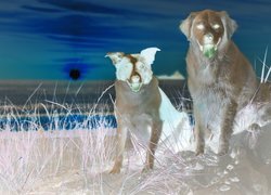 Edytor tapety: Morze, Zachód, Słońca, Dwa, Psy