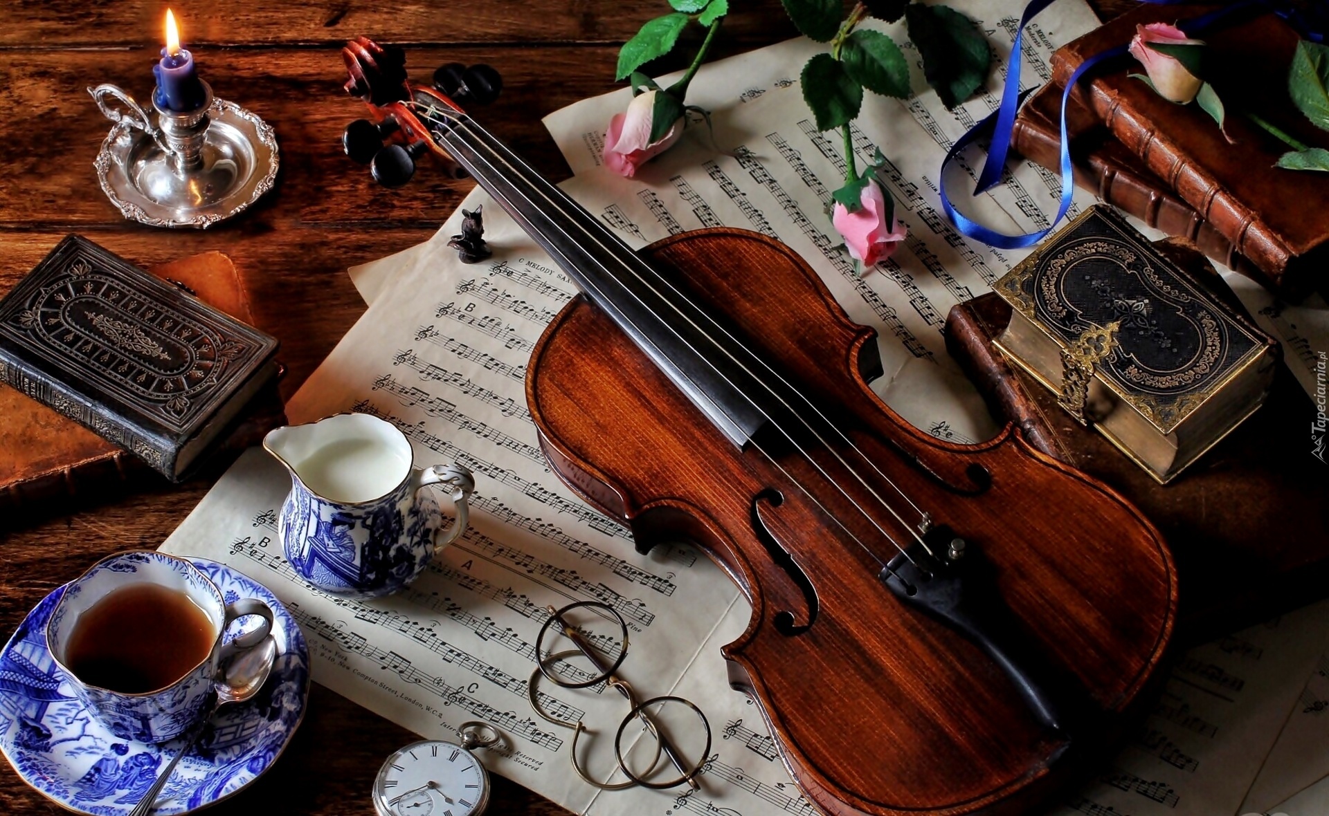 Edytor tapety: Skrzypce, Nuty, Kawa, Róże, Zegarek