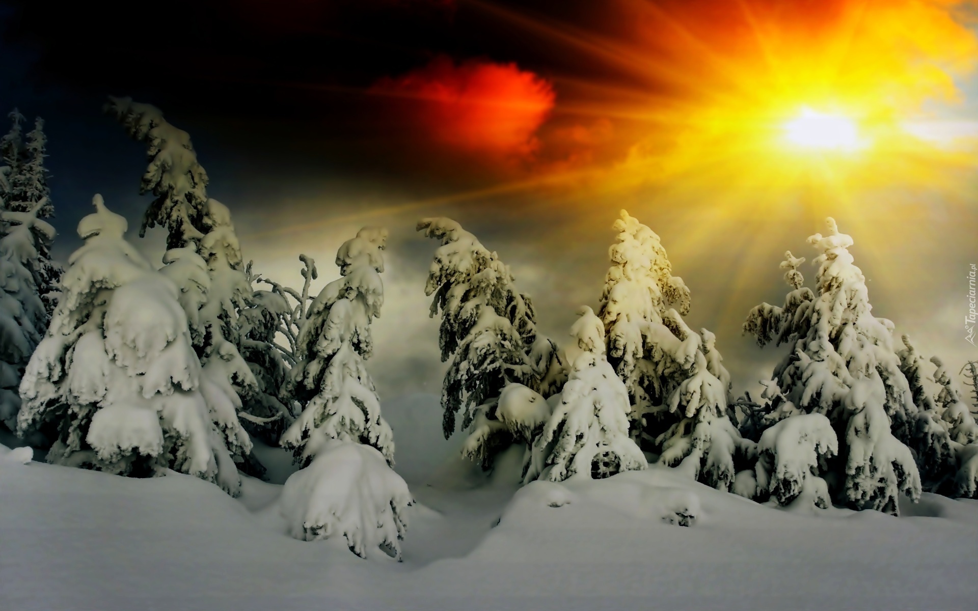 Edytor tapety: Zima, Las, Śnieg, Zachód słońca