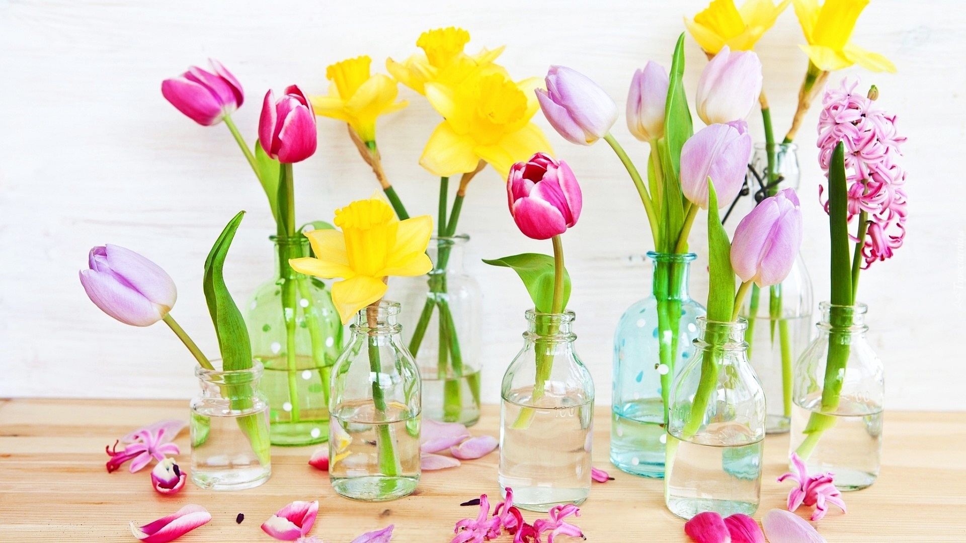 Edytor tapety: Kwiaty, Tulipany, Hiacynt, Żonkile, Butelki, Buteleczki