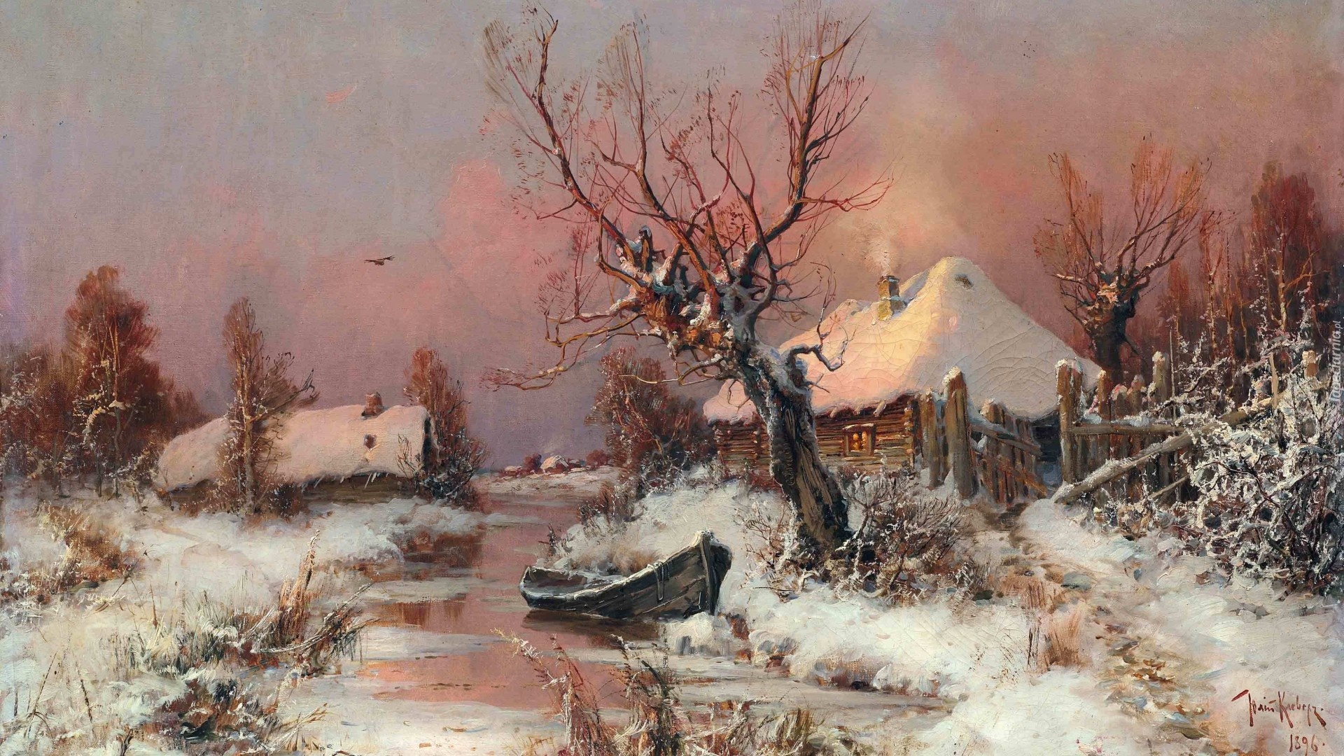 Edytor tapety: Malarstwo, Obraz, Rzeczka, Domy, Chatki, Łódka, Zima