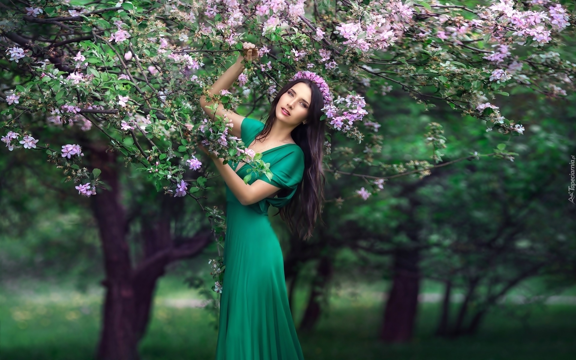 Edytor tapety: Kobieta, Brunetka, Wianek, Park, Kwitnące, Drzewa, Kwiaty