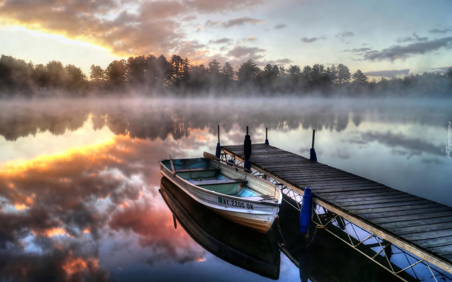 Edytor tapety: Łódka, Molo, Jezioro, Mgła, Las
