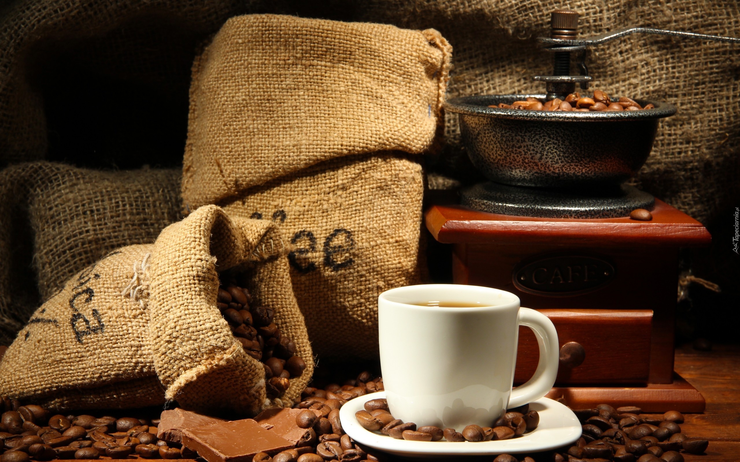Edytor tapety: Kawa, Filiżanka, Młynek, Ziarna