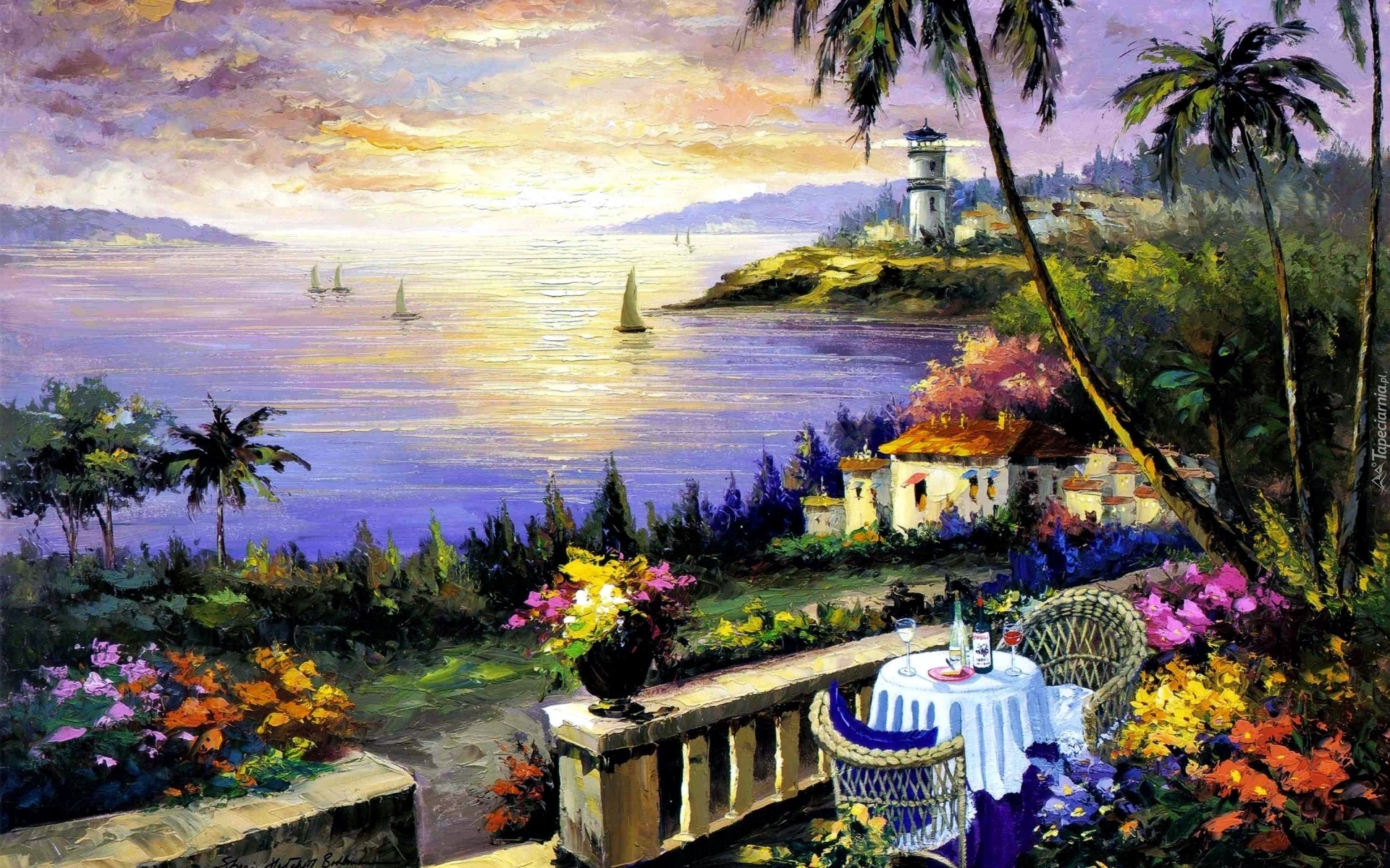 Edytor tapety: Malarstwo, Obraz, Morze, Latarnia Morska, Żaglówki, Taras