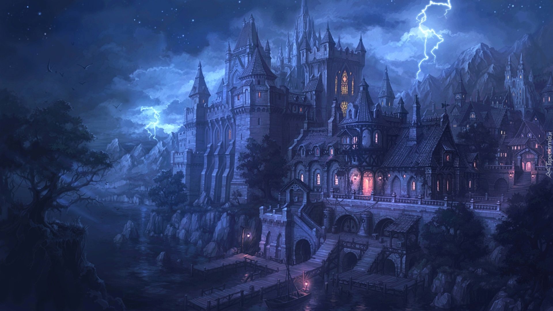 Edytor tapety: Zamek, Noc, Burza, Pioruny, Fantasy