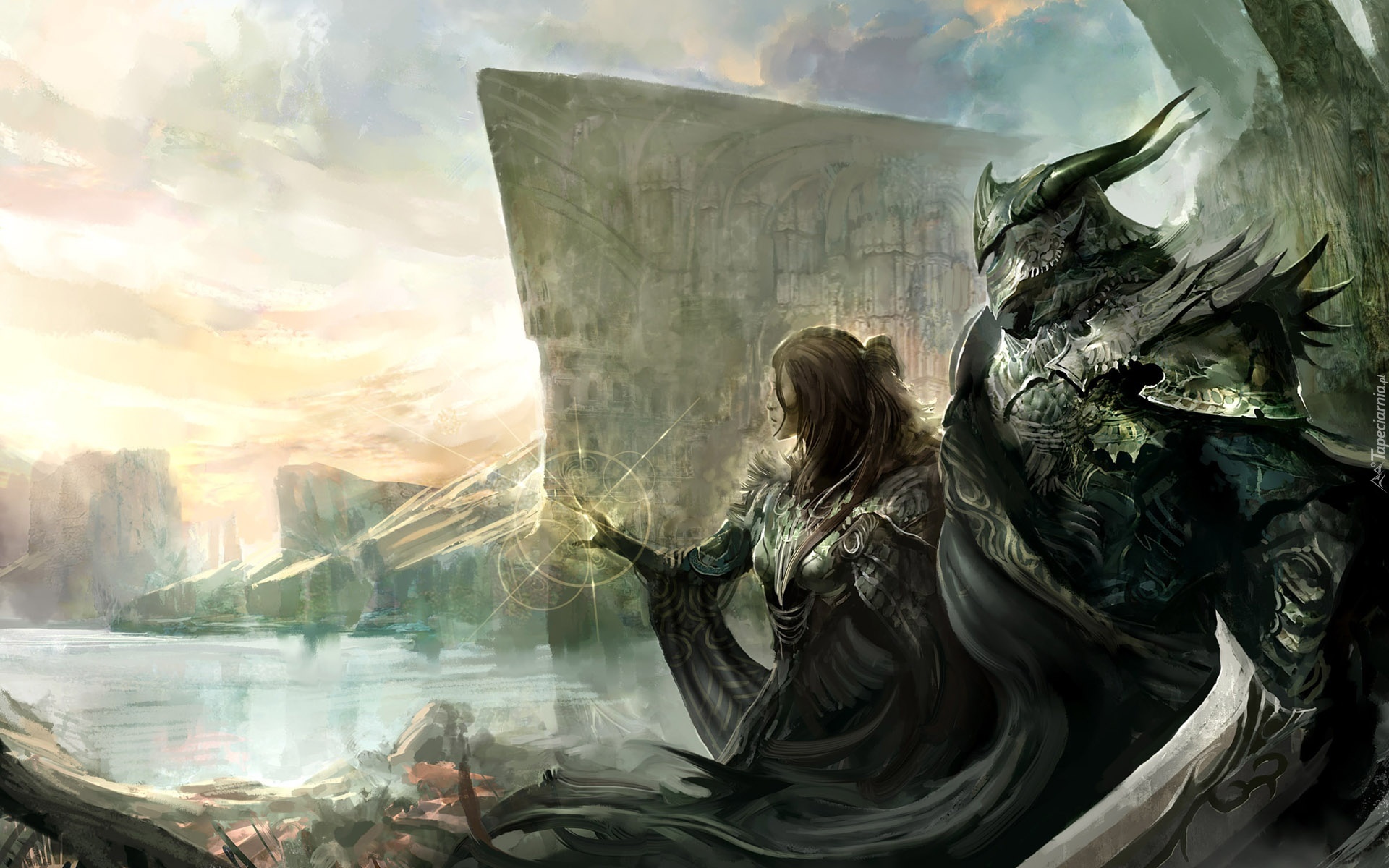 Edytor tapety: Kobieta, Mroczny, Rycerz, Jezioro, Świt
