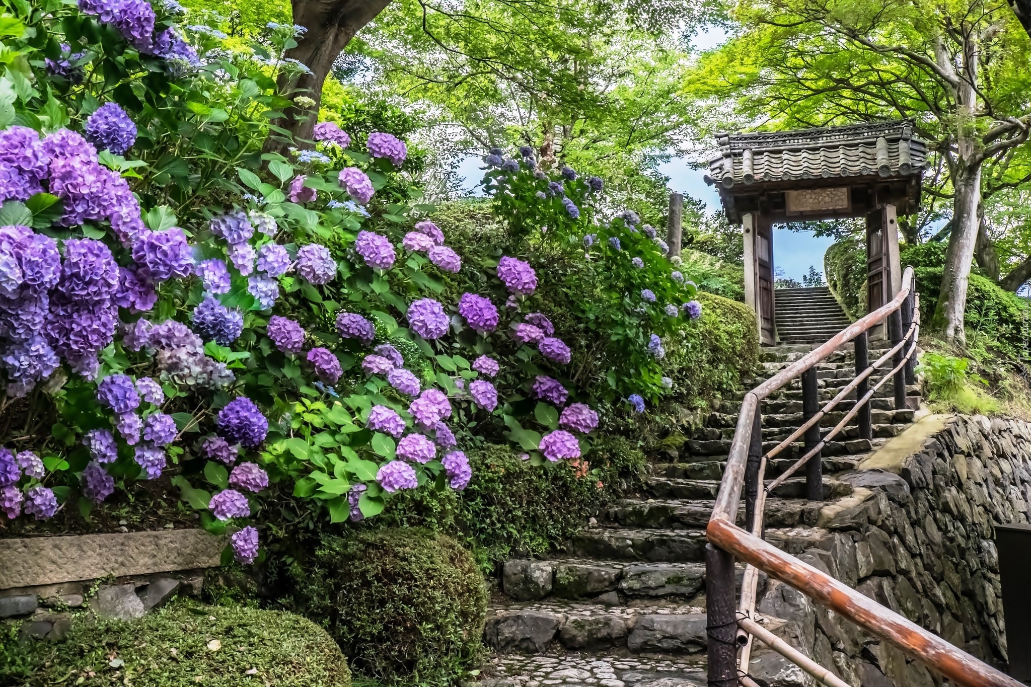 Edytor tapety: Ogród, Schody, Hortensja, Japonia