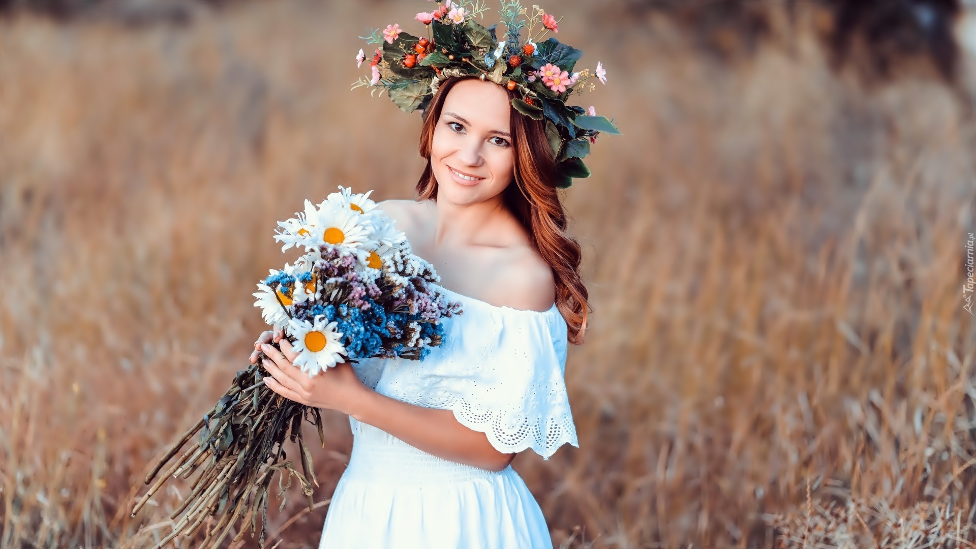 Edytor tapety: Kobieta, Wianek, Bukiet, Polnych, Kwiatów, Łąka