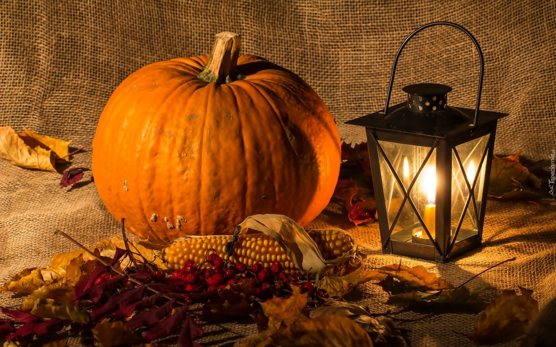 Edytor tapety: Dynia, Lampion, Kukurydza, Liście, Kompozycja, Jesienna