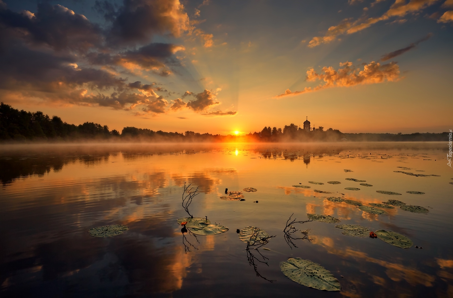 Edytor tapety: Jezioro, Mgła, Wschód słońca