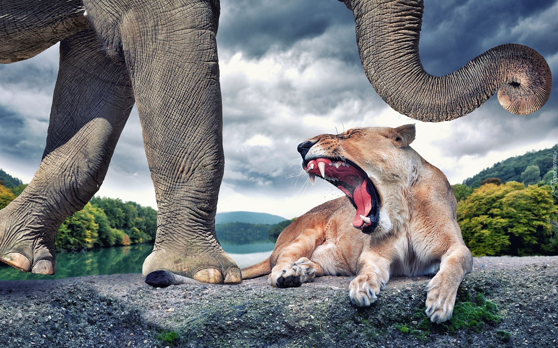 Edytor tapety: Nieostrożny, Słoń, Lew, Śmieszne