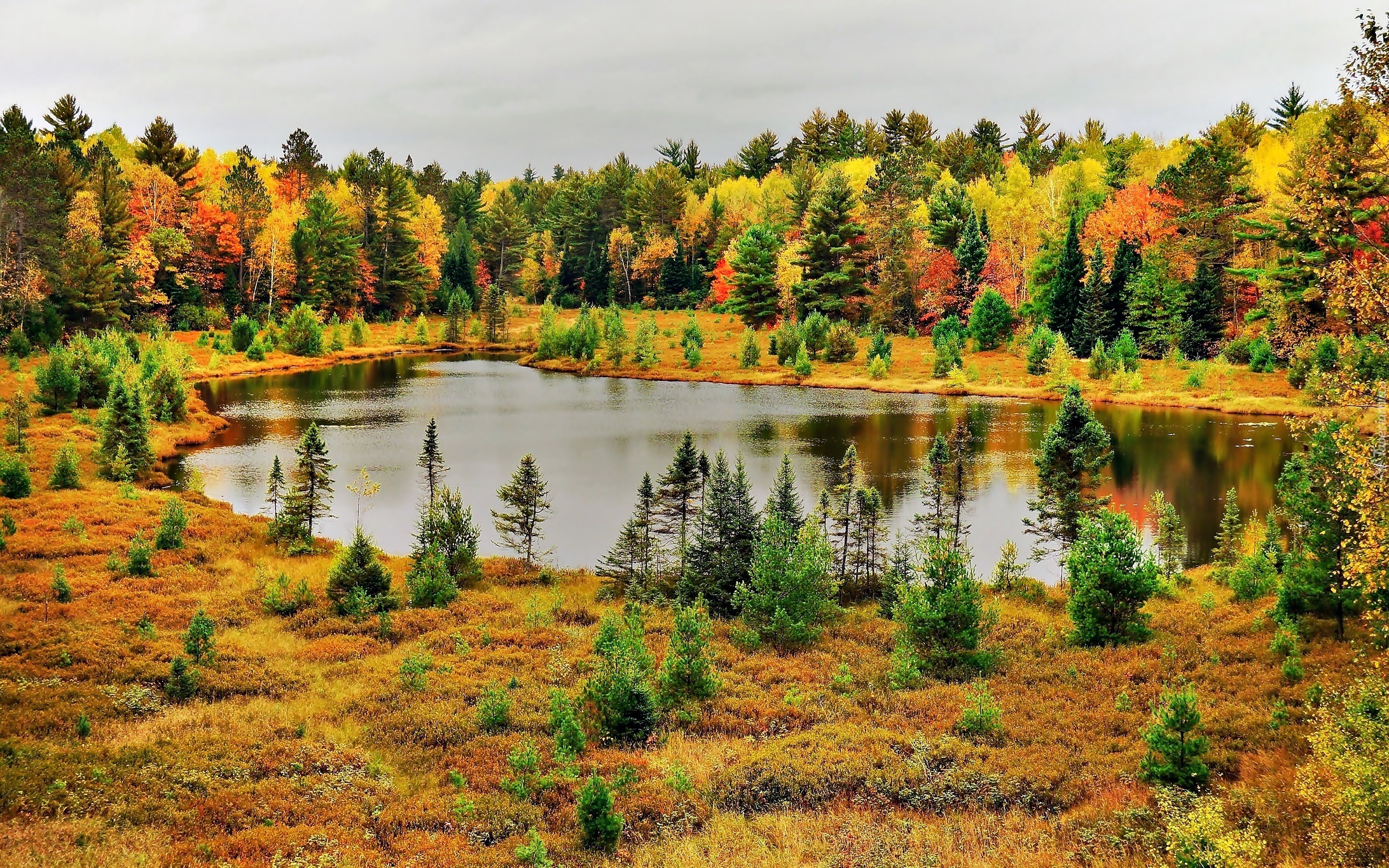 Edytor tapety: Kolorowy, Las, Jeziorko, Jesień