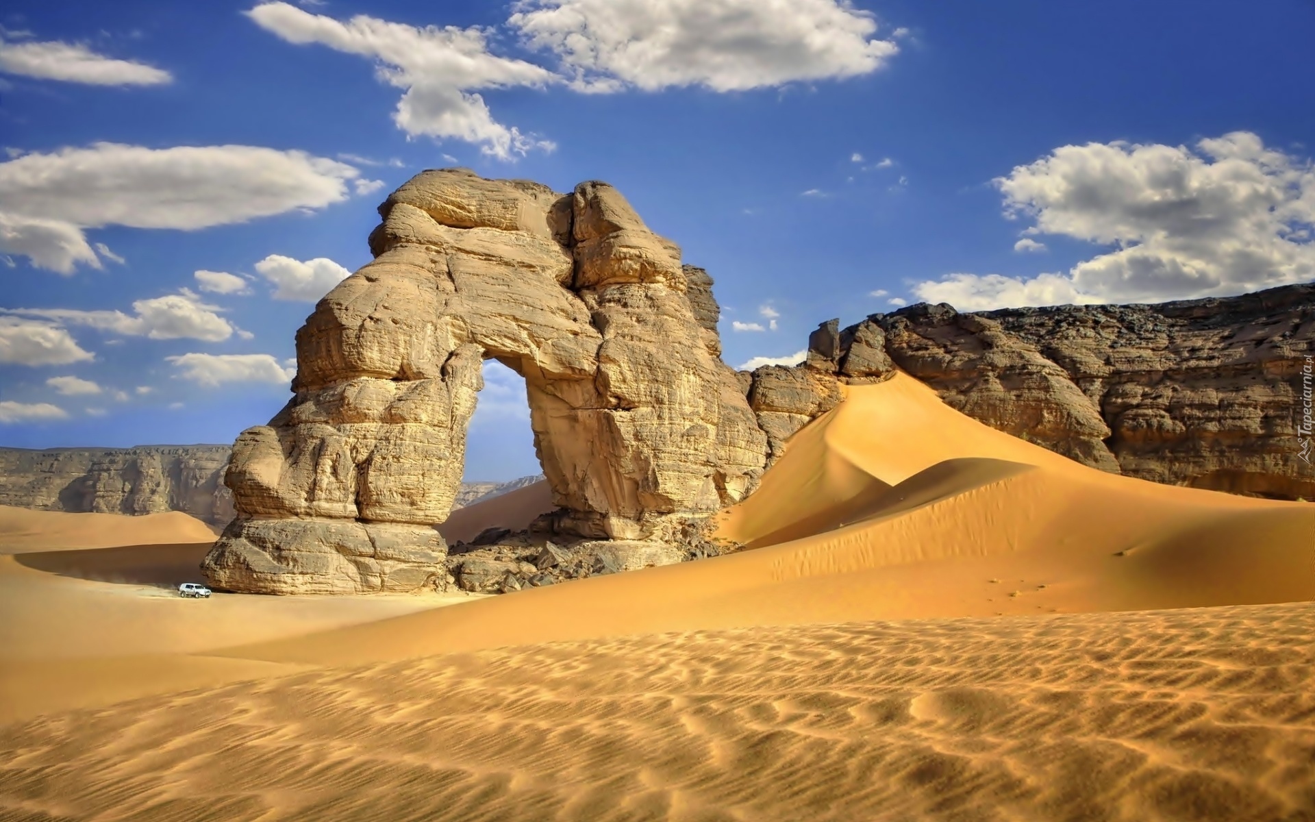 Edytor tapety: Pustynia, Skały, Wydmy, Samochód