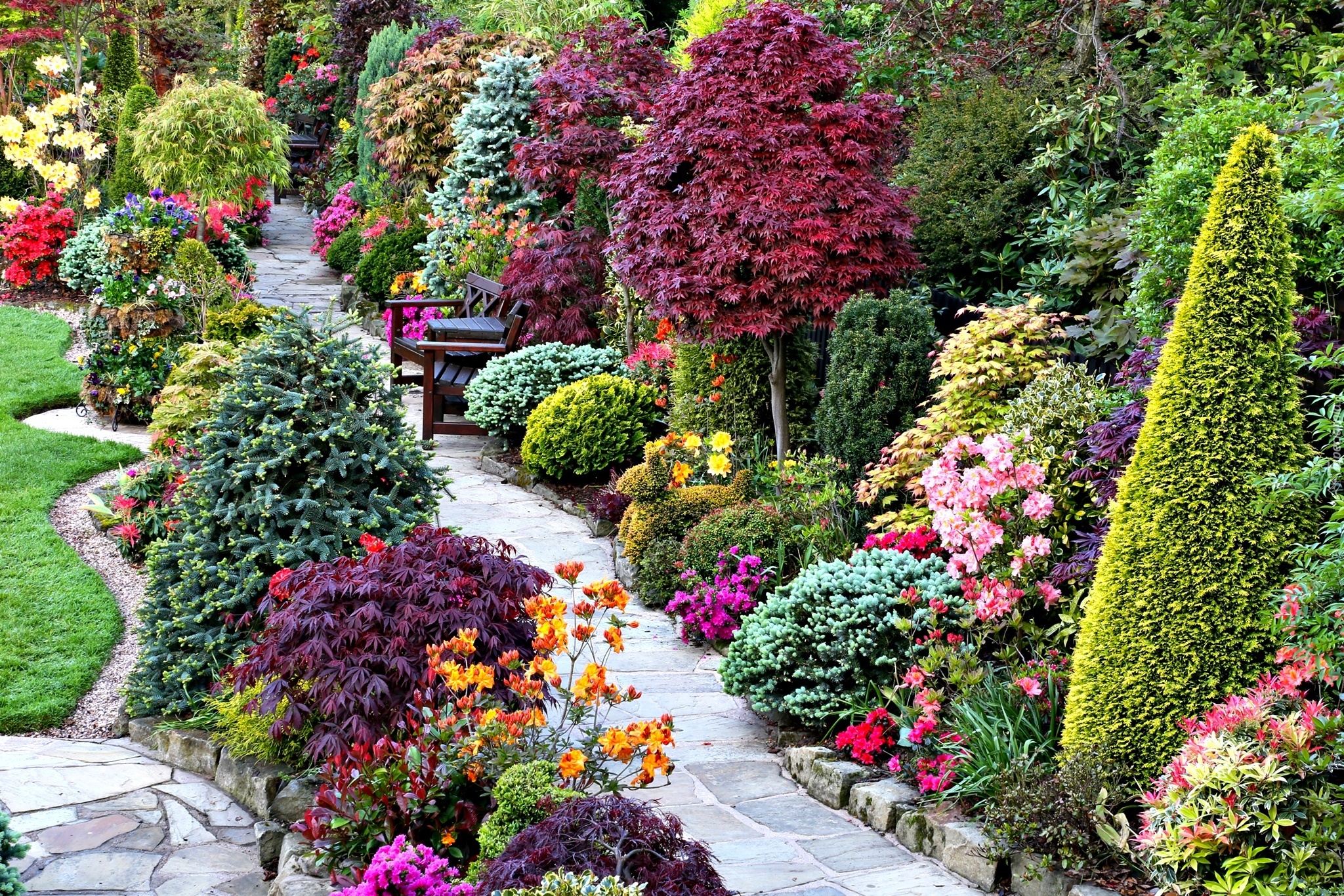 Edytor tapety: Ogród, Kolorowe, Krzewy, Kwiaty, Alejka, Ławka