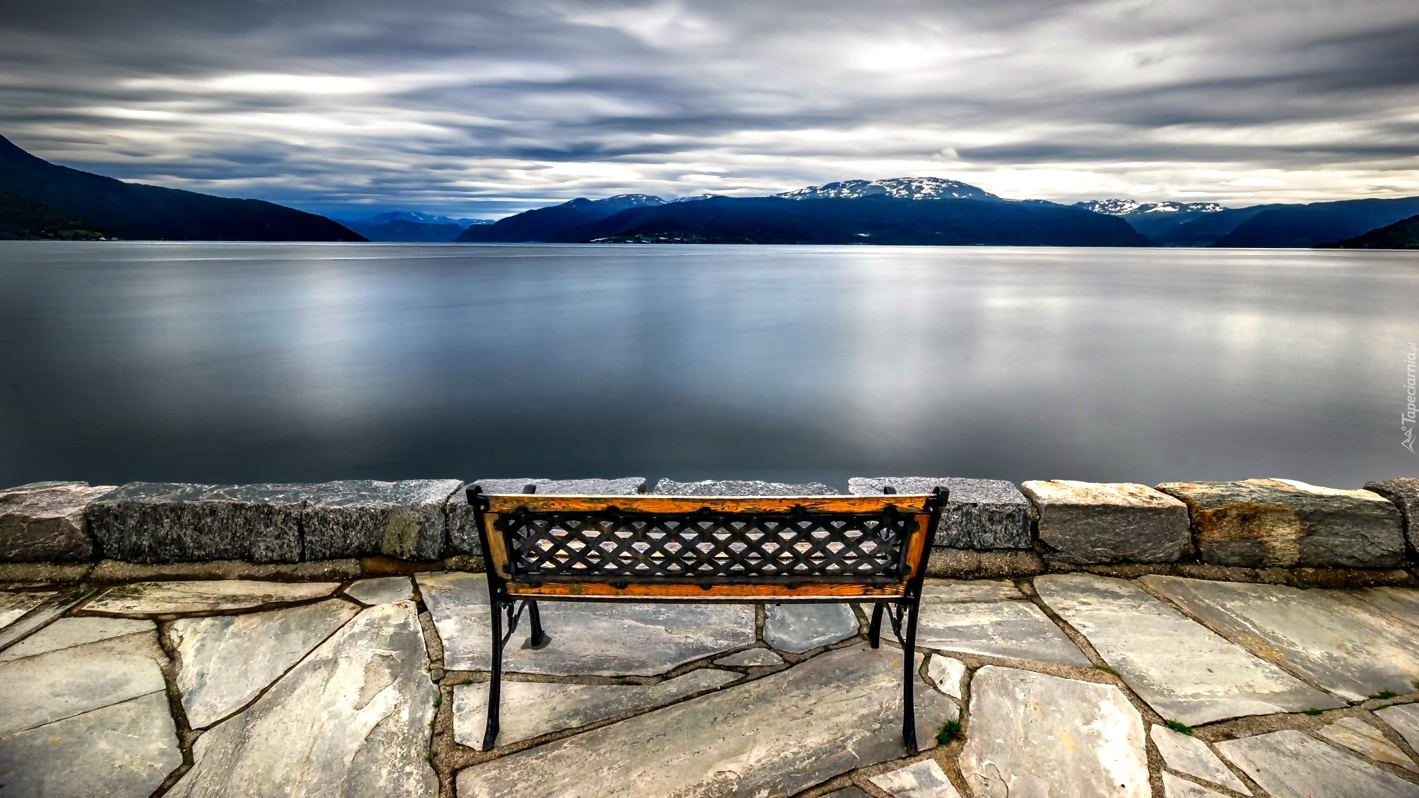 Edytor tapety: Jezioro, Wzgórz, Bulwar, Ławka, Widok
