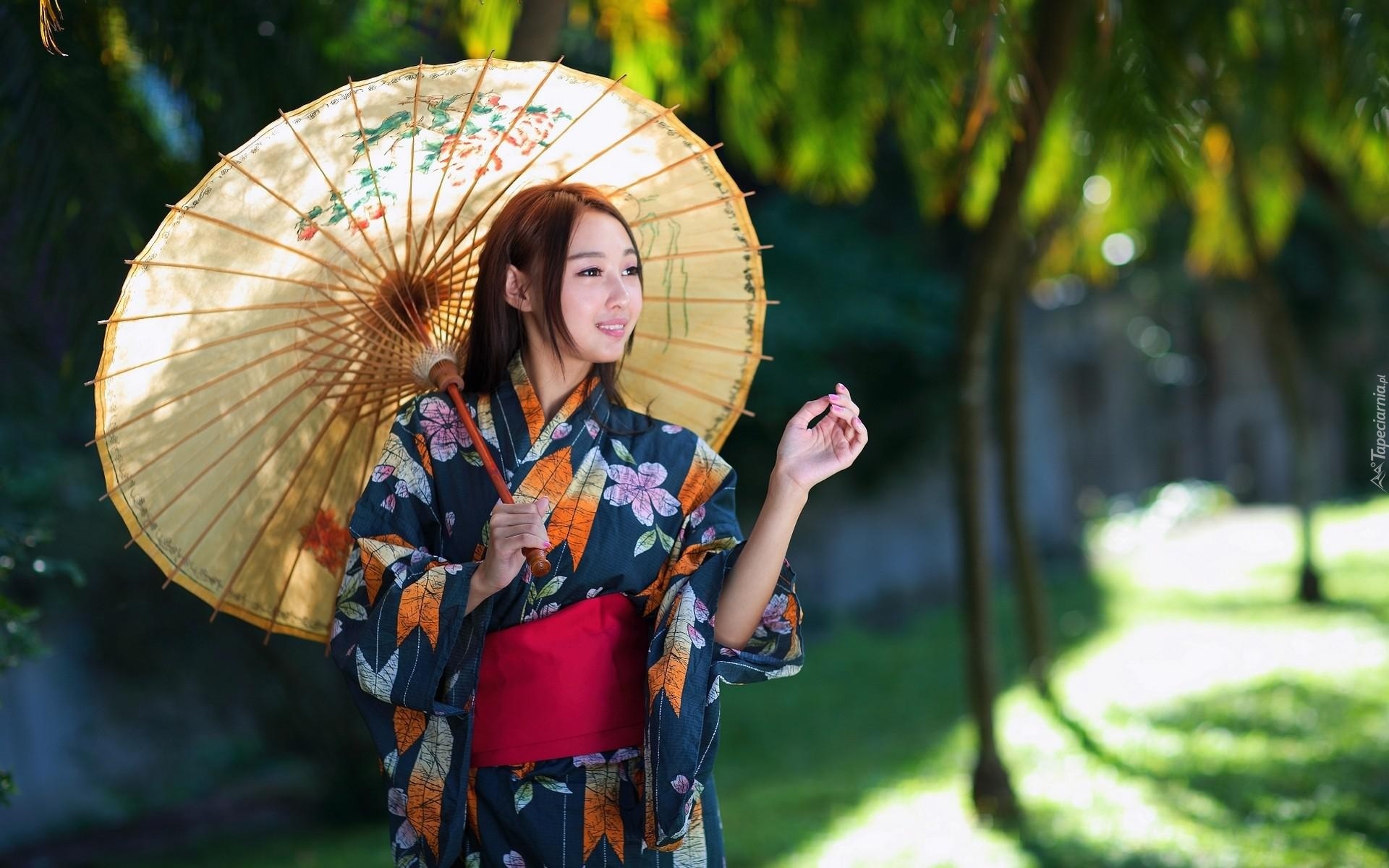 Edytor tapety: Uśmiechnięta, Azjatka, kimono, Parasolka