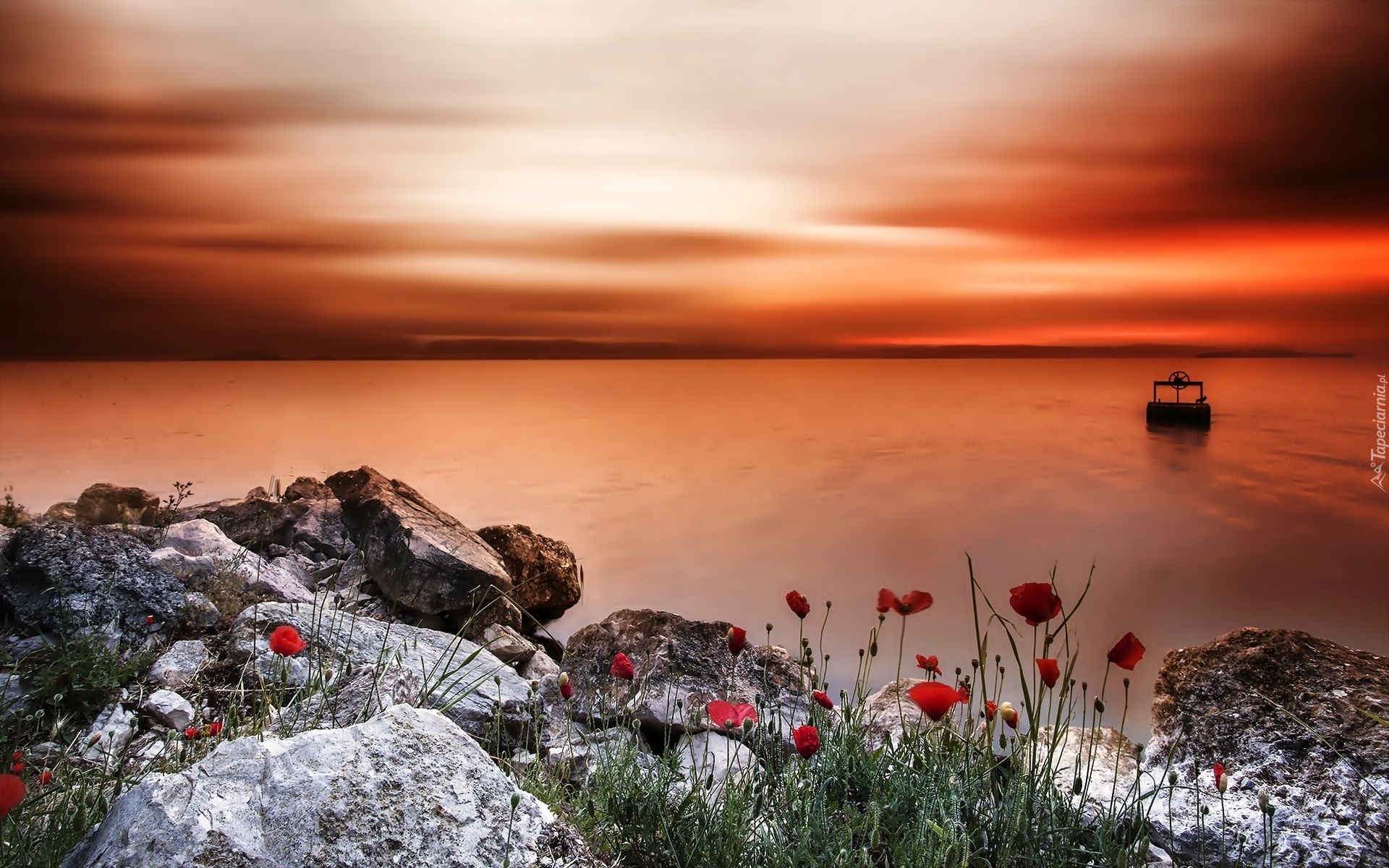 Edytor tapety: Morze, Skały, Zachód Słońca, Maki