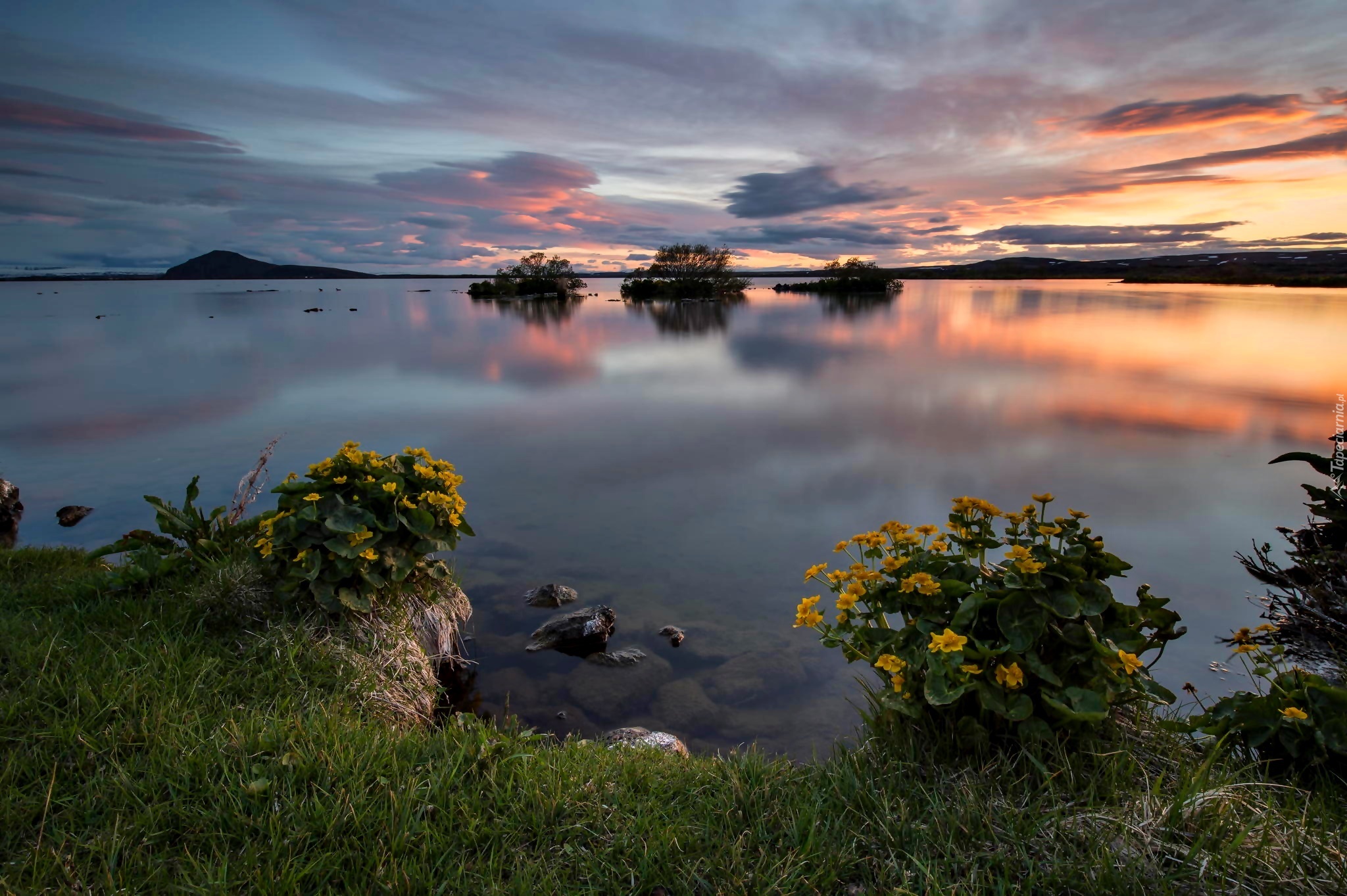 Edytor tapety: Jezioro, Kwiaty, Świt