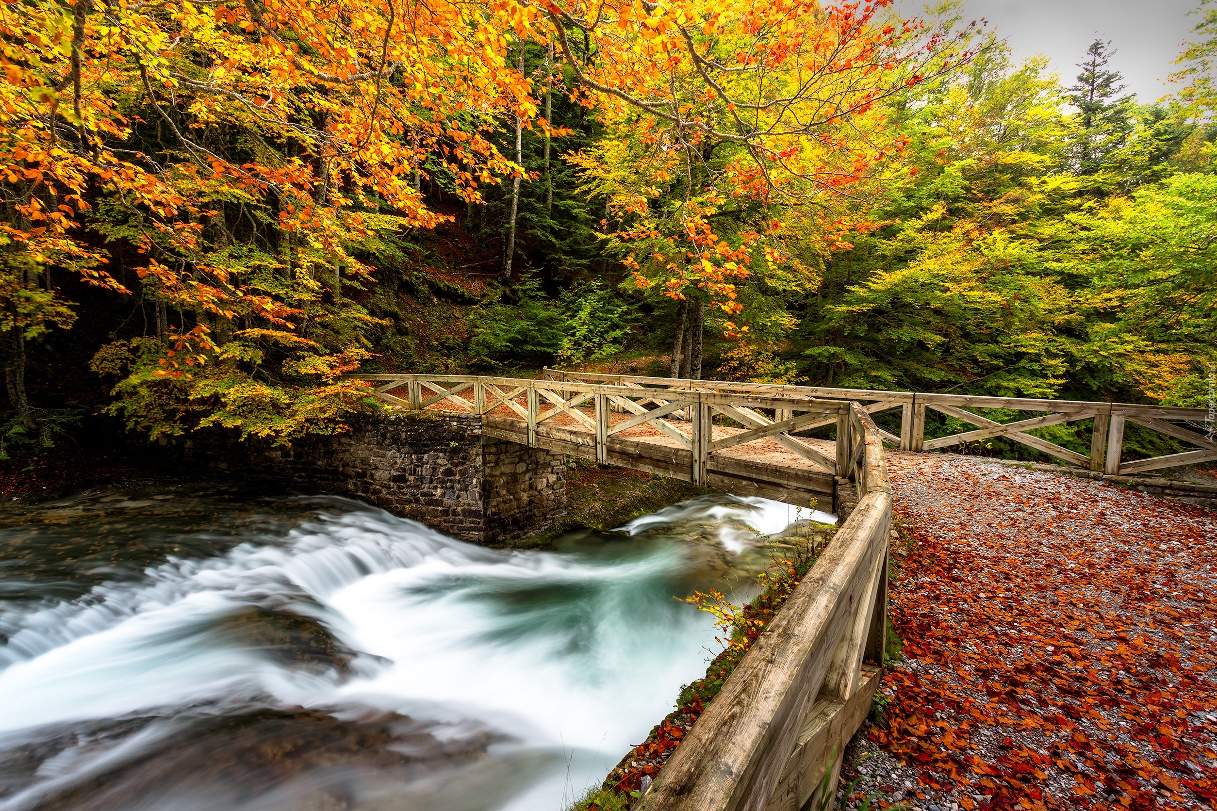 Edytor tapety: Droga, Most, Rwąca Rzeka, Drzewa, Jesień