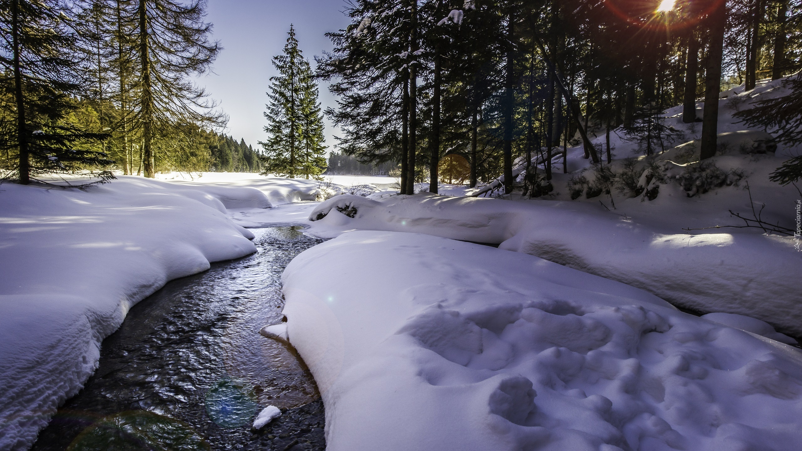 Edytor tapety: Zima, Rzeczka, Las, Promienie Słońca