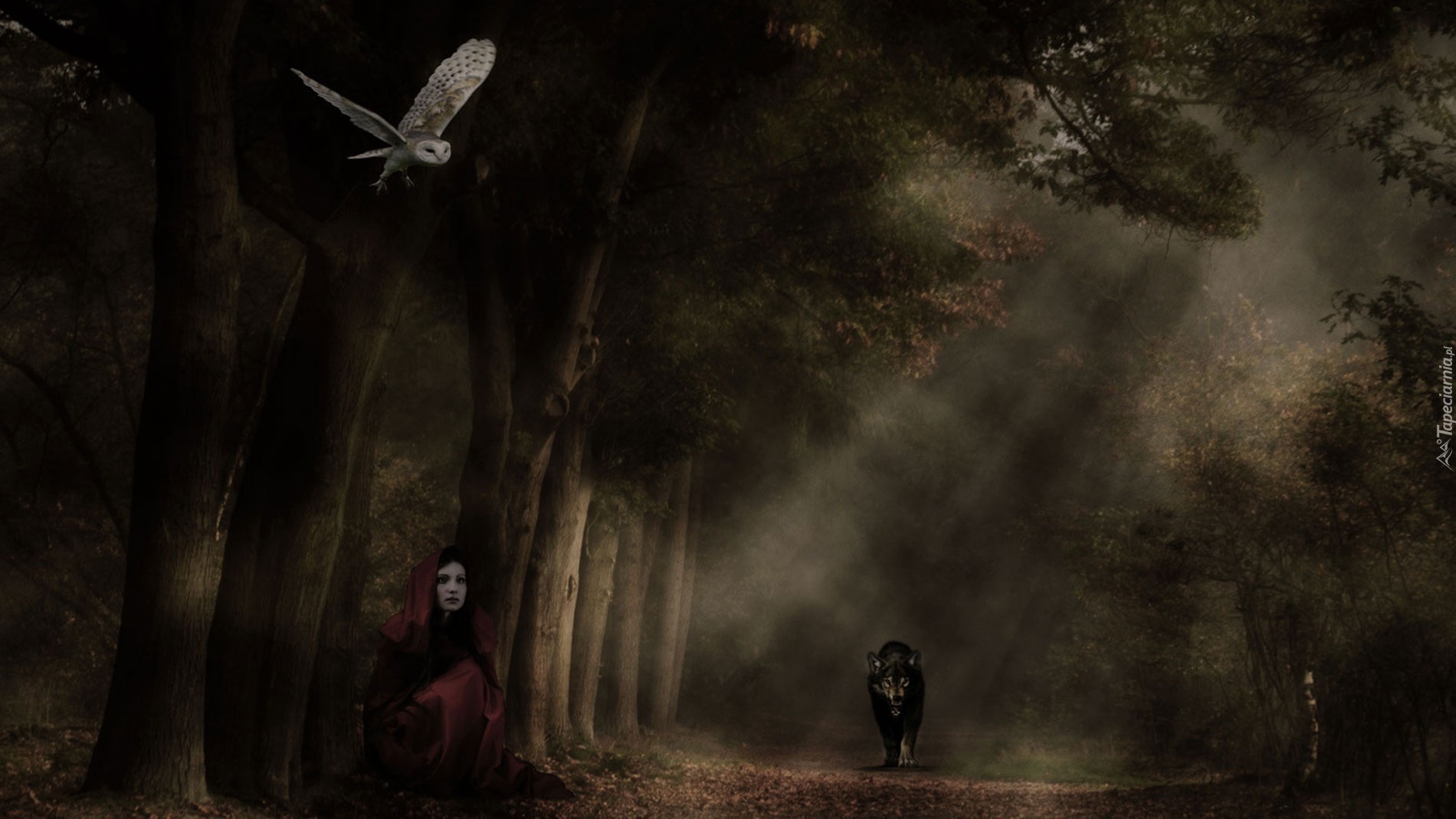 Edytor tapety: Czerwony kapturek, Wilk, Sowa, Las