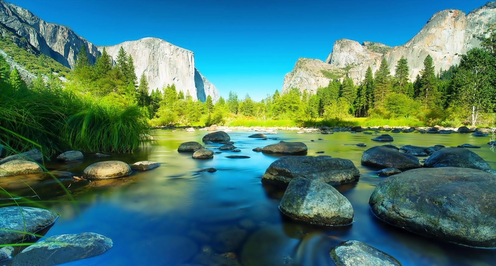 Edytor tapety: Stany Zjednoczone, Stan Kalifornia, Park Narodowy Yosemite, Góry, Drzewa, Las, Kamienie, Rzeka