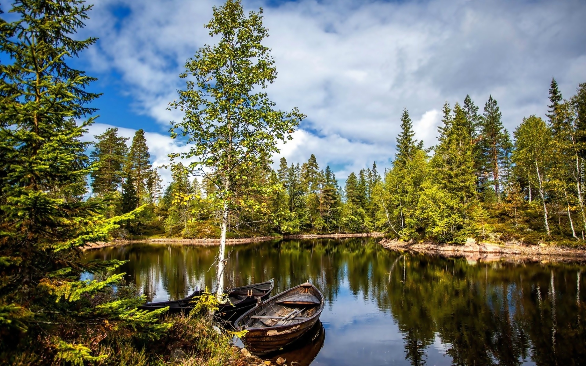 Edytor tapety: Rzeka, Las, Łódki, Jesień