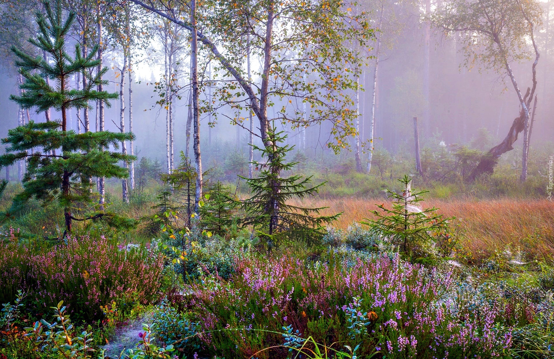 Edytor tapety: Las, Poranek, Mgła, Rośliny, Wrzosy