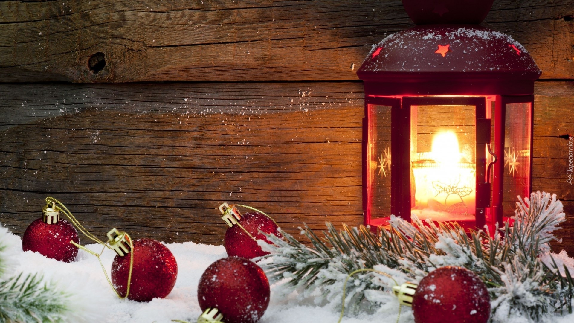 Edytor tapety: Lampion, Czerwone, Bombki, Śnieg, Gałązka, Dekoracja, Boże Narodzenie