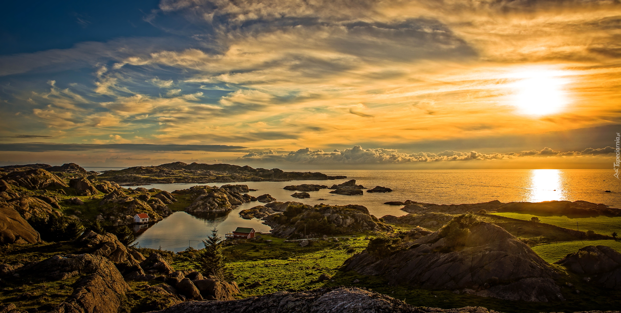 Edytor tapety: Zachód słońca, Morze Północne, Domki, Skały, Wybrzeże, Chmury, Egersund, Rogaland, Norwegia