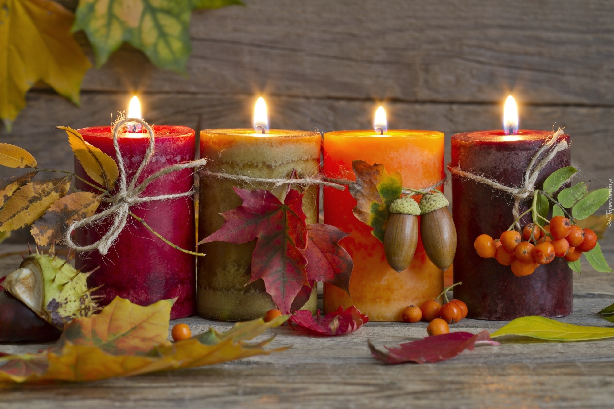 Edytor tapety: Kolorowe, Świeczki, Żołędzie, Jarzębina, Liście, Dekoracje