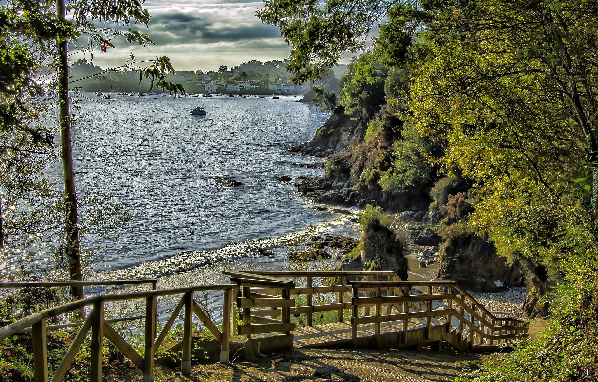 Edytor tapety: Morze, Wybrzeże, Drzewa, Mostek
