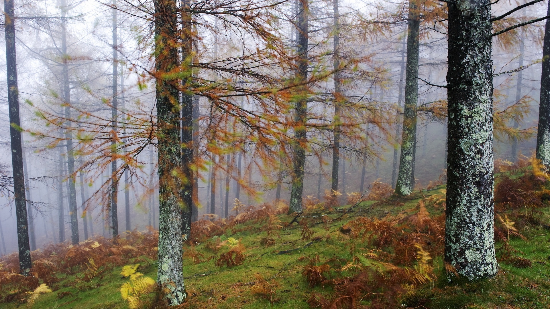 Edytor tapety: Jesień, Las, Drzewa, Paprocie, Mgła