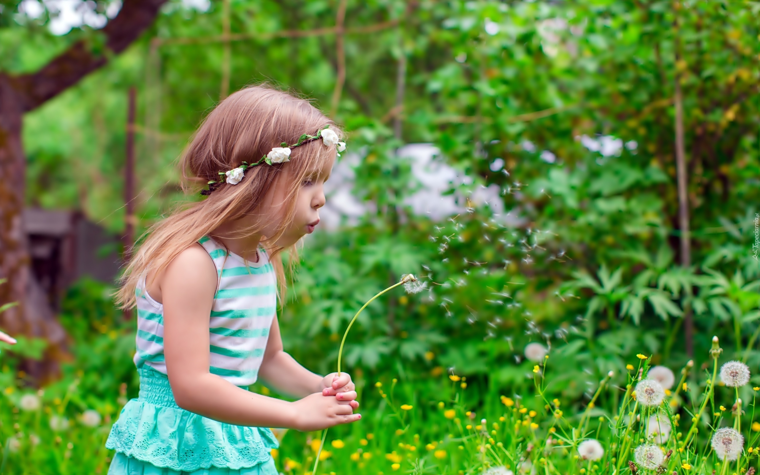 Edytor tapety: Dziewczynka, Wianuszek, Łąka, Dmuchawce, Lato