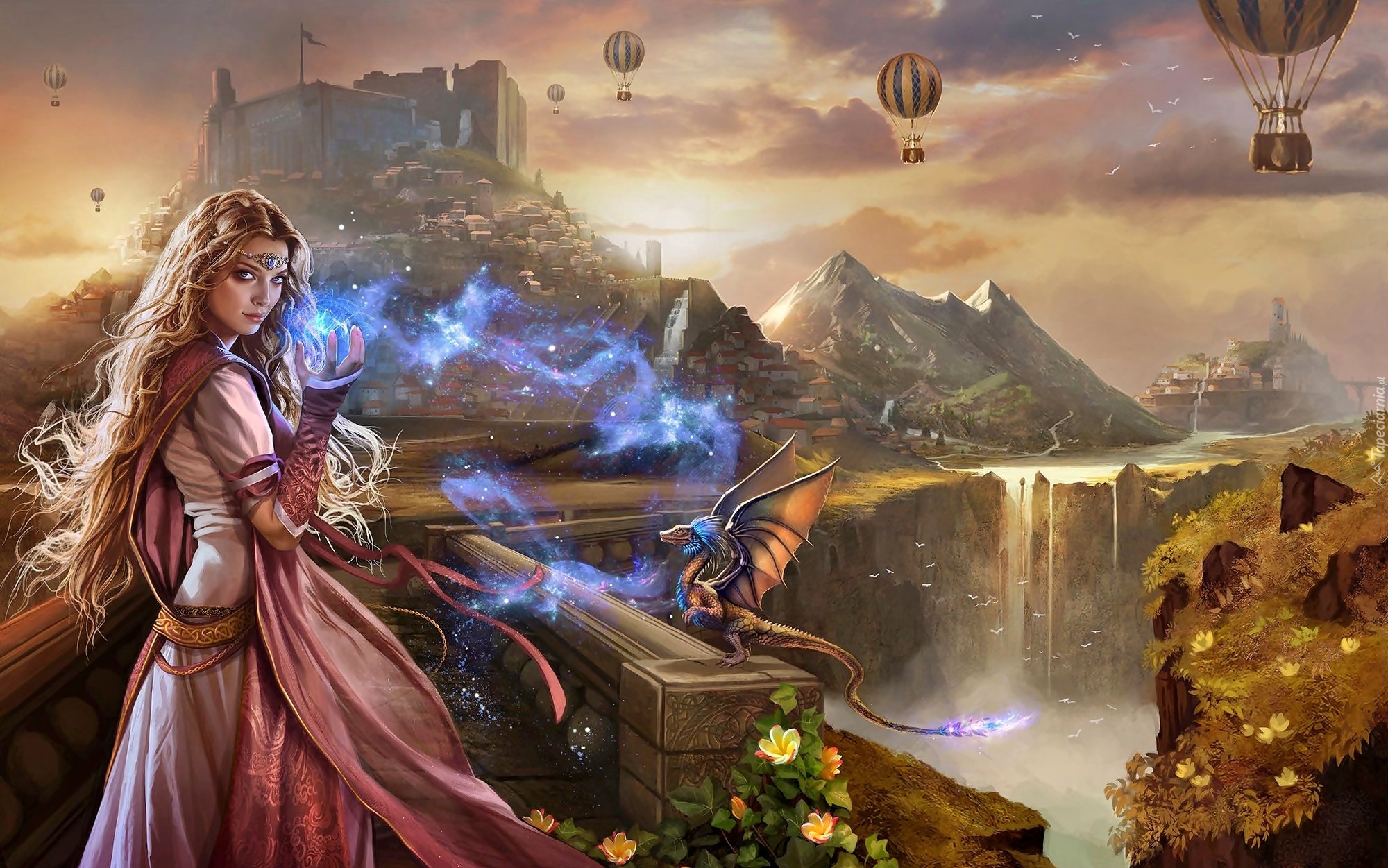 Edytor tapety: Kobieta, Góry, Zamek, Czarodziejska, Kula, Balony,Smok