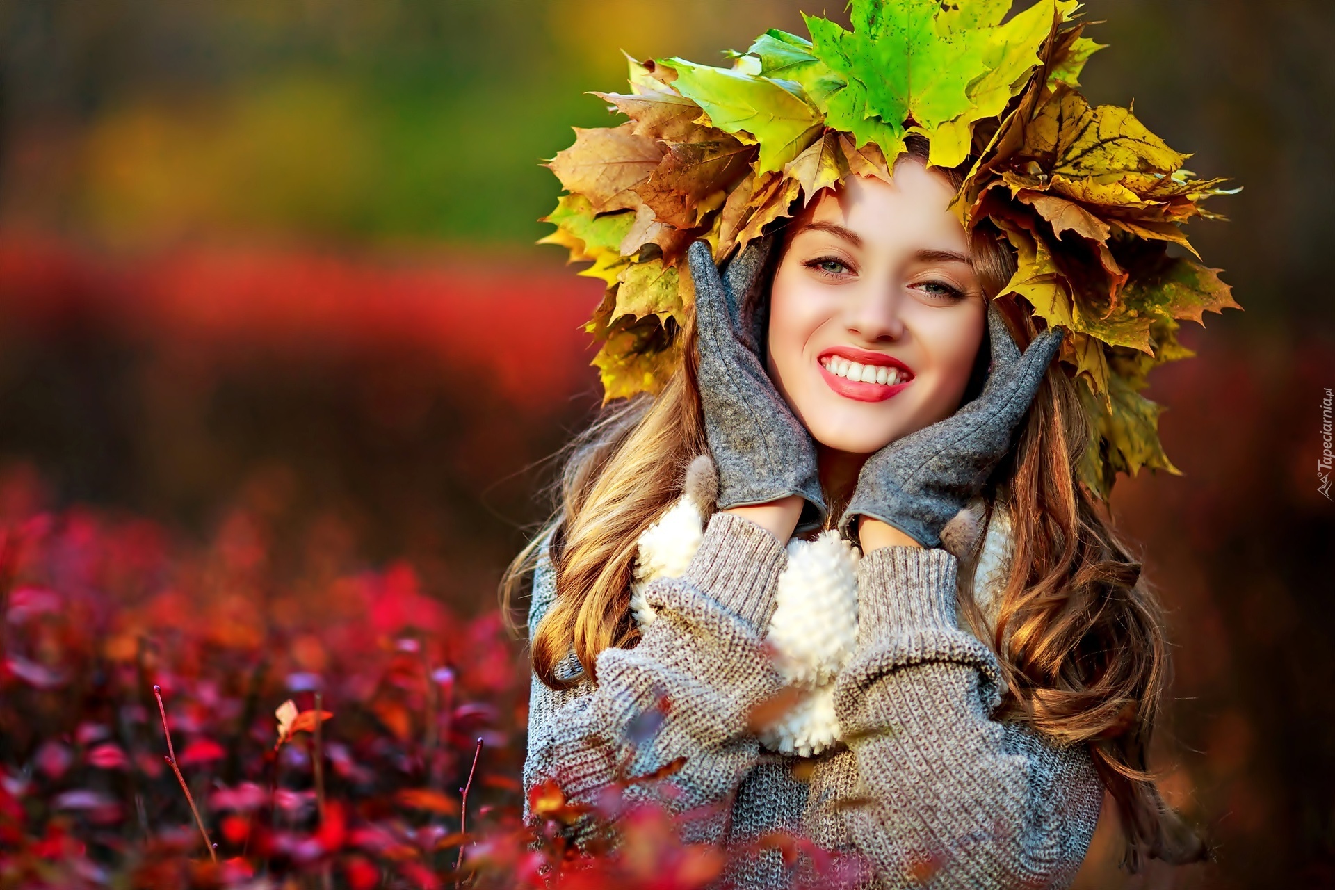 Edytor tapety: Uśmiechnięta, Kobieta, Jesienne, Liście, Wianek