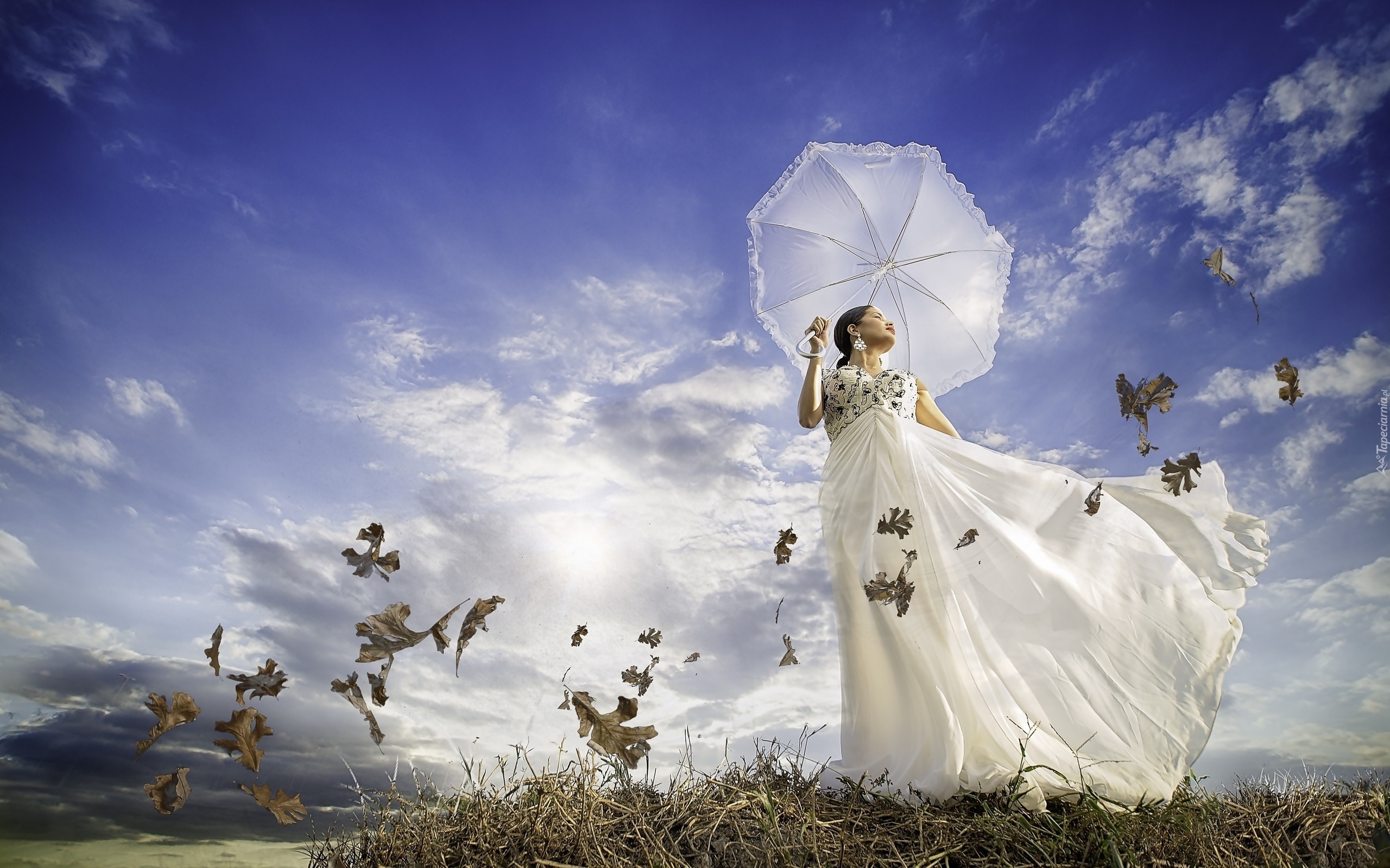 Edytor tapety: Niebo, Chmury, Kobieta, Parasolka, Wiatr, Liście