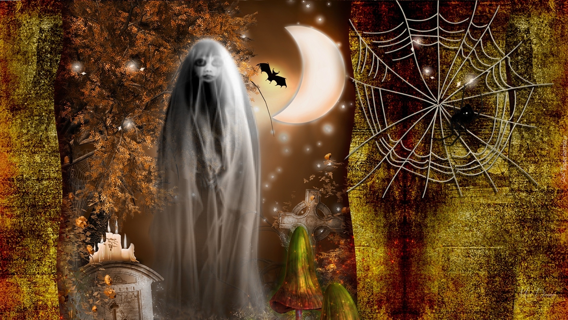 Edytor tapety: Halloween, Duch, Pajęczyna, Księżyc, Nagrobek, Świece, Nietoperz