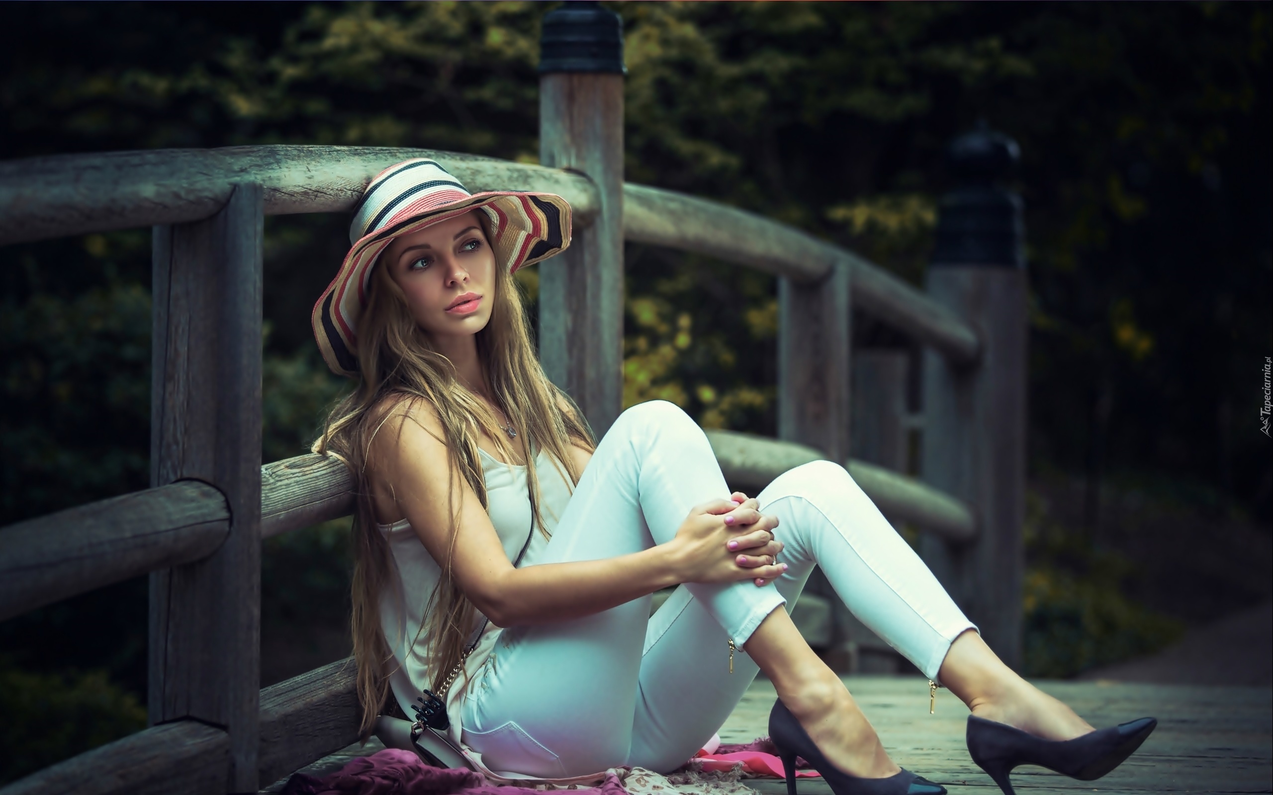 Edytor tapety: Modelka, Blondynka, Most, Rzeka, Las