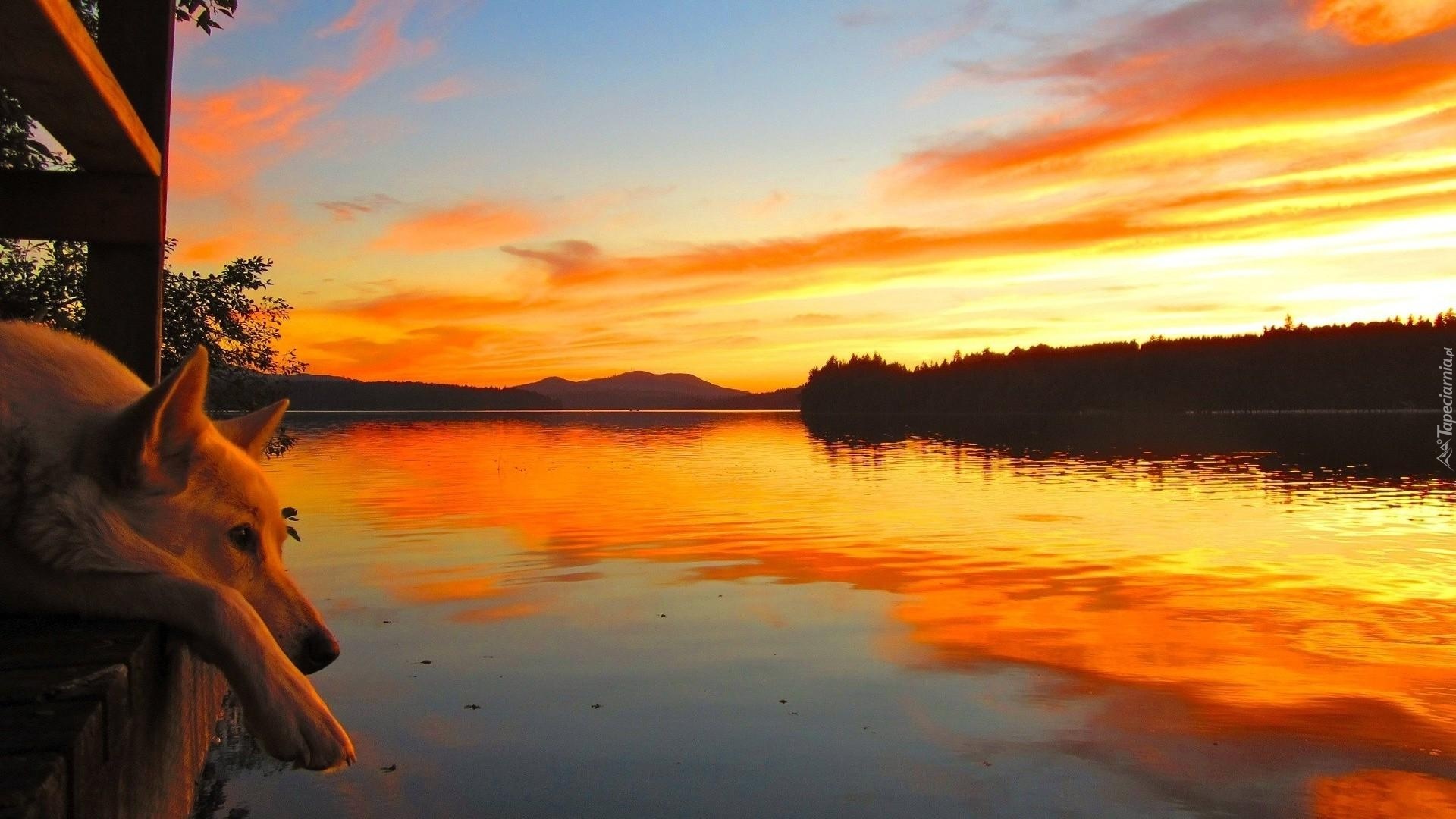 Edytor tapety: Pies, Na, Pomoście, JeZioro, Zachód, Słońca