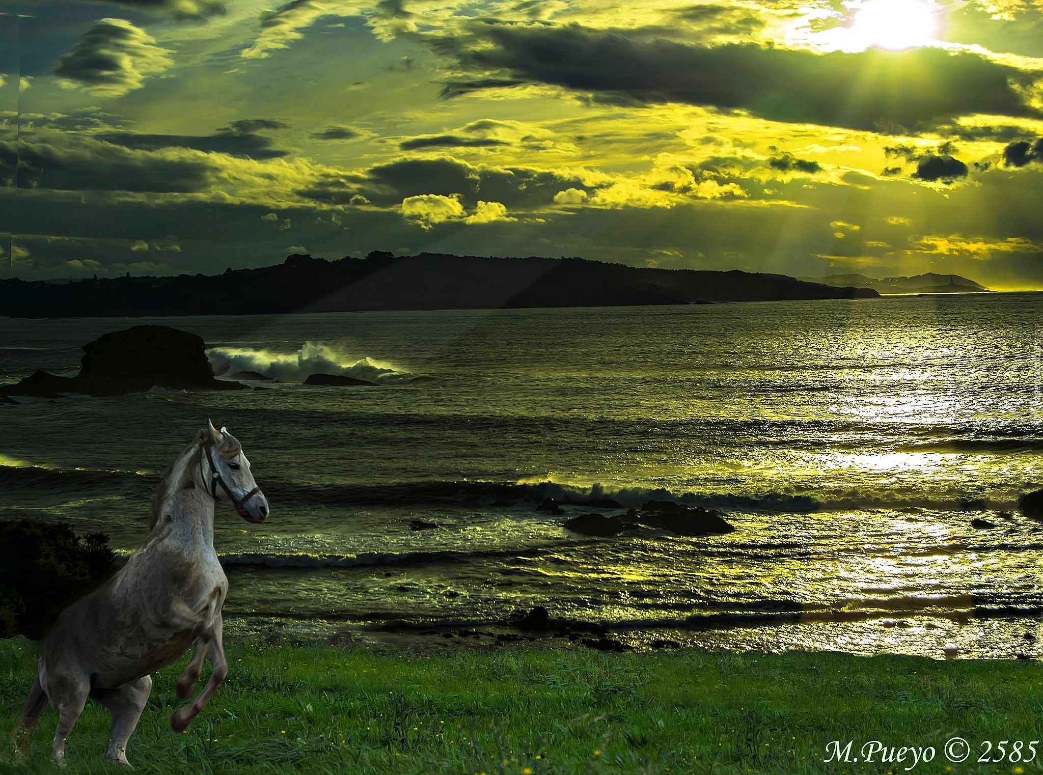Edytor tapety: Wschód Słońca, Morze, Koń, Łąka