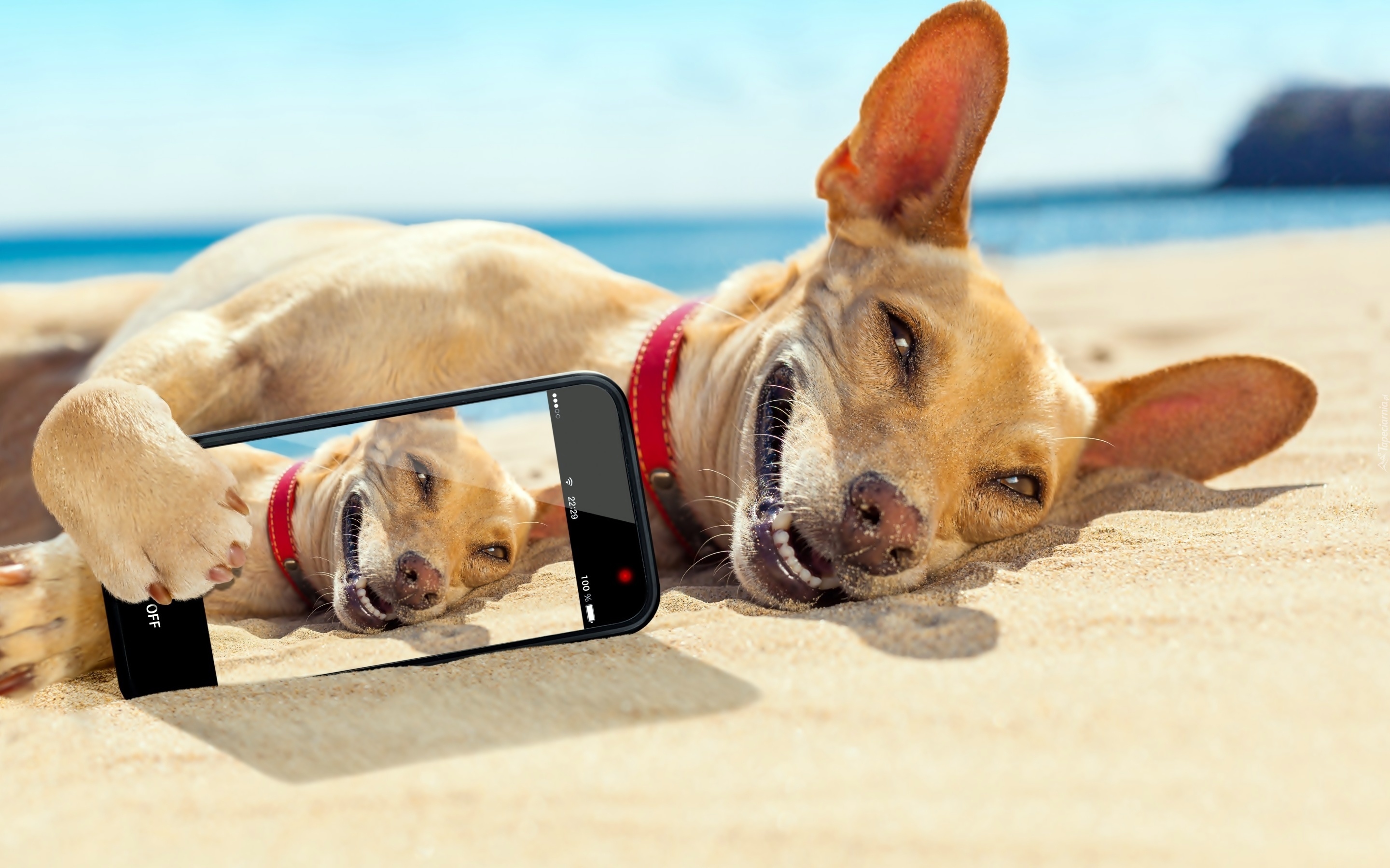 Edytor tapety: Pies, Plaża, Morze, Telefon, Selfie